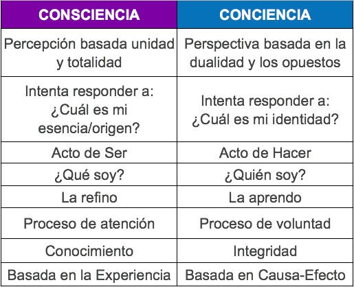 La consciencia es algo que experimentamos desde que existimos y que vamos refinando con el paso de la experiencia, a diferencia de la conciencia que es algo que vamos adquiriendo según vamos moldeando a nuestra identidad o quiénes somos en esta realidad.