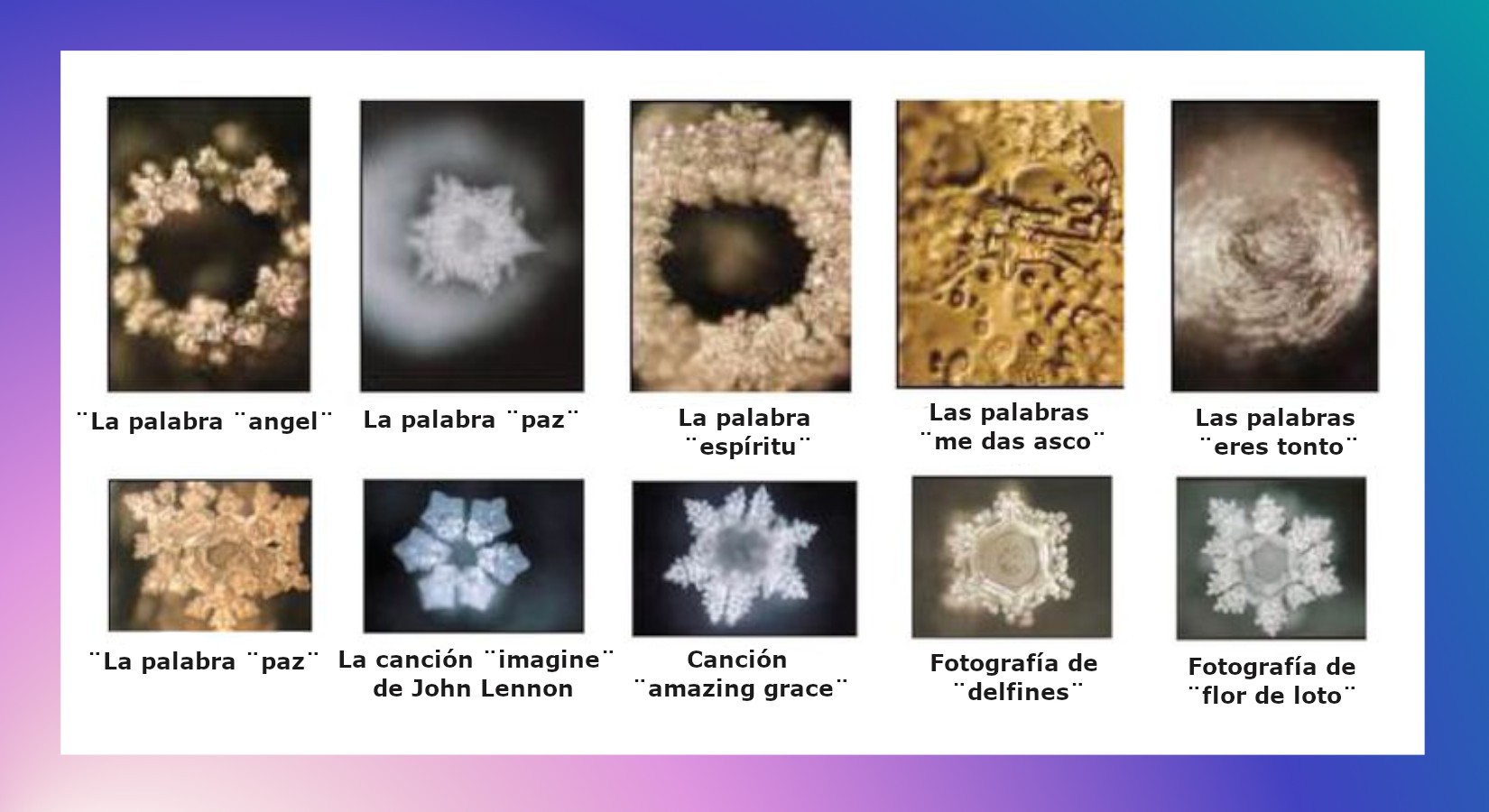 Aquí están algunos ejemplos de cómo sonidos dirigidos al agua o de cómo ciertas palabras escritas o fotografías en los contenedores de la misma afectan la estructura del agua a nivel microscópico aunque no podamos percibirlo a simple vista.